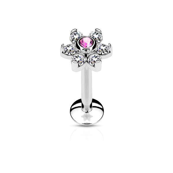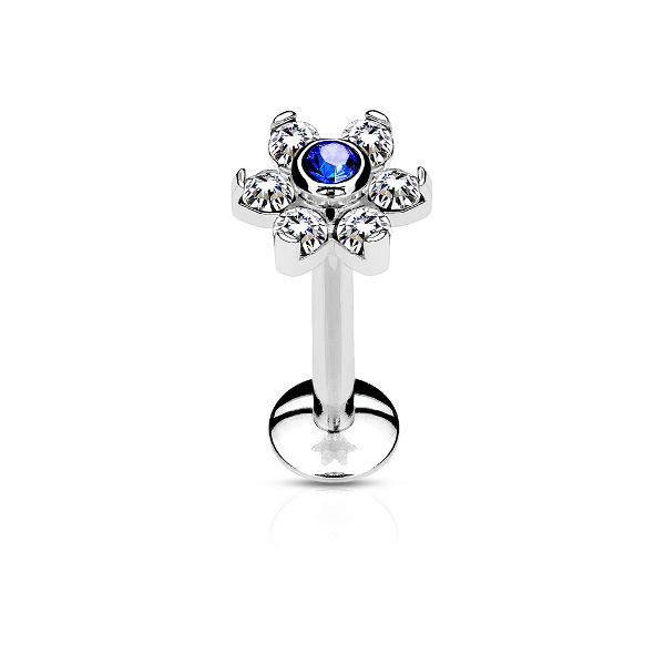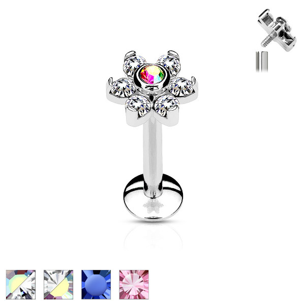 Лабрет с внутренней резьбой из хирургической стали 316L с накруткой в форме цветка диаметром 6 мм, украшенного кристаллами. В описании указан цвет центрального кристалла.