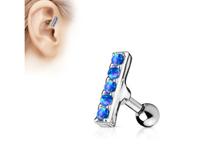 Микроштанга из хирургической стали 316L с кластером из пяти лабораторных опалов на родированной латунной основе.