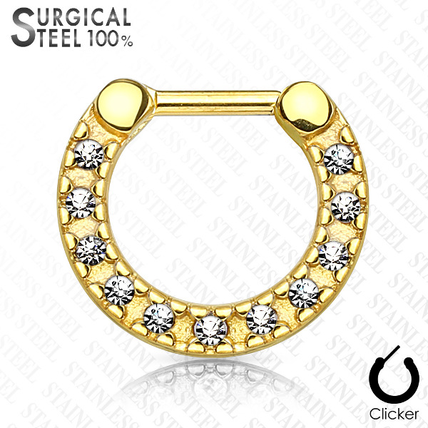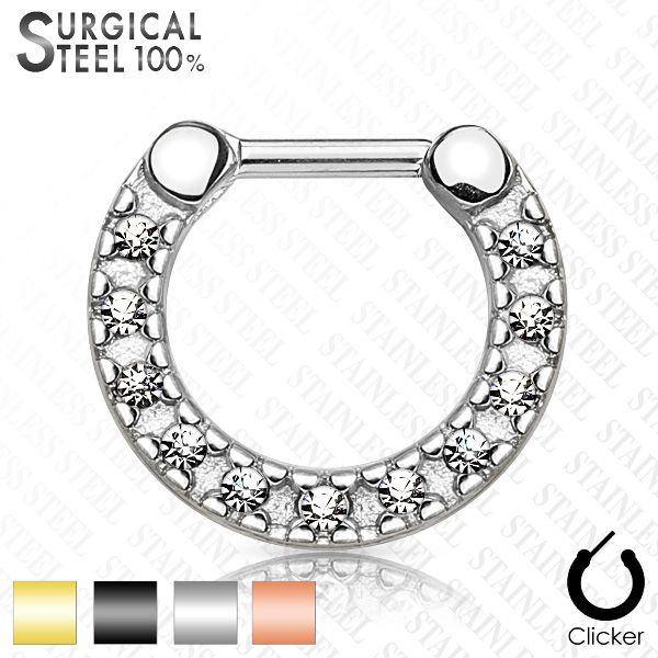 Кликер из хирургической стали 316L, украшенный прозрачными кристаллами.