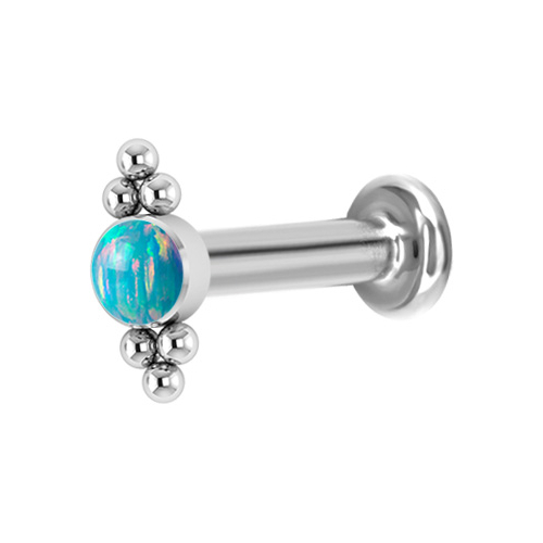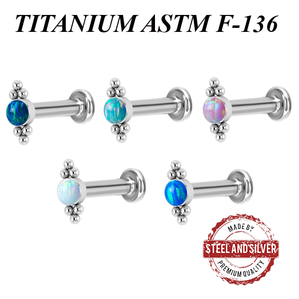 Лабрет из имплантационного титана 6Al-4V-Eli ASTM: F-136 с внутренней резьбой. Украшен лабораторным опалом.