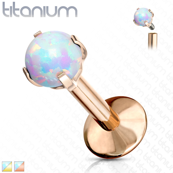 Лабрет из имплантационного титана 6Al-4V-Eli ASTM: F-136 с титановым IP покрытием. Дополнен лабораторным опалом в лапках. Внутренняя резьба.