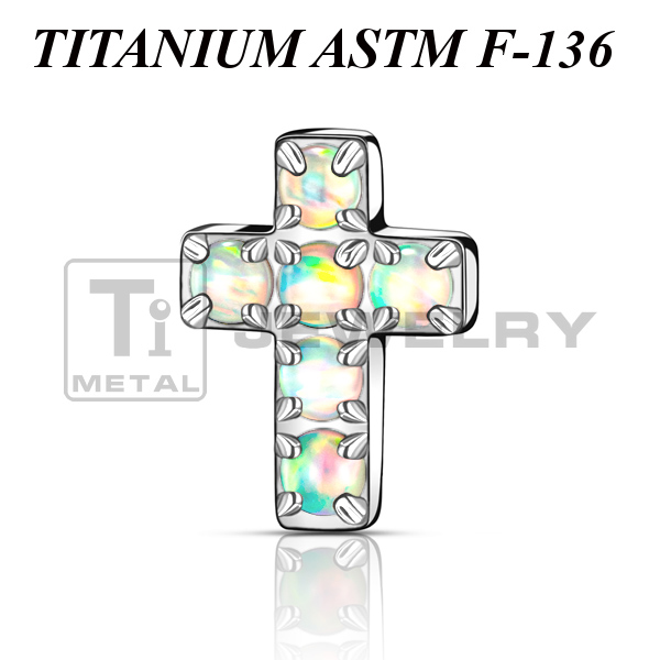 Накрутка из имплантационного титана 6Al-4V-Eli ASTM: F-136 в форме креста, украшенного лабораторными опалами. Размер декоративной части: 4х6мм. Подходит для украшений с внутренней резьбой толщиной 1,6 мм.