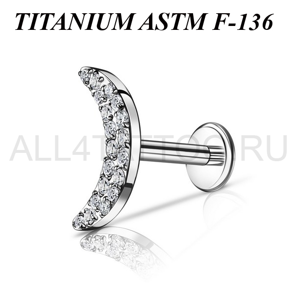 Лабрет из имплантационного титана 6Al-4V-Eli ASTM: F-136 с внутренней резьбой и накруткой в форме полумесяца, украшенного множеством прозрачных фианитов. Размер декоративной части: 5х10мм.