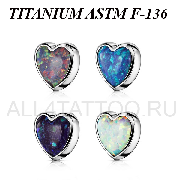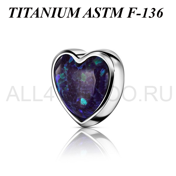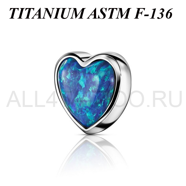 Накрутка из имплантационного титана 6Al-4V-Eli ASTM: F-136 в форме сердца. Украшена лабораторным опалом. Размер декоративной части 5х5мм. Подходит для украшений с внутренней резьбой.