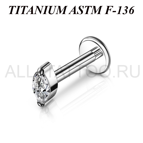 Лабрет с внутренней резьбой из имплантационного титана 6Al-4V-Eli ASTM: F-13. Украшен прозрачным фианитом огранки "маркиз" размером 2х4мм.