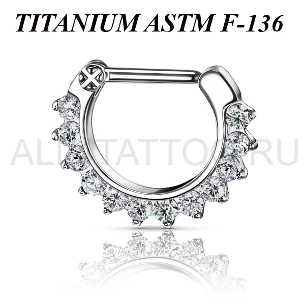 Кликер для септума из имплантационного титана 6Al-4V-Eli ASTM: F-136, с декоративной частью украшенной сетом прозрачных фианитов.