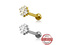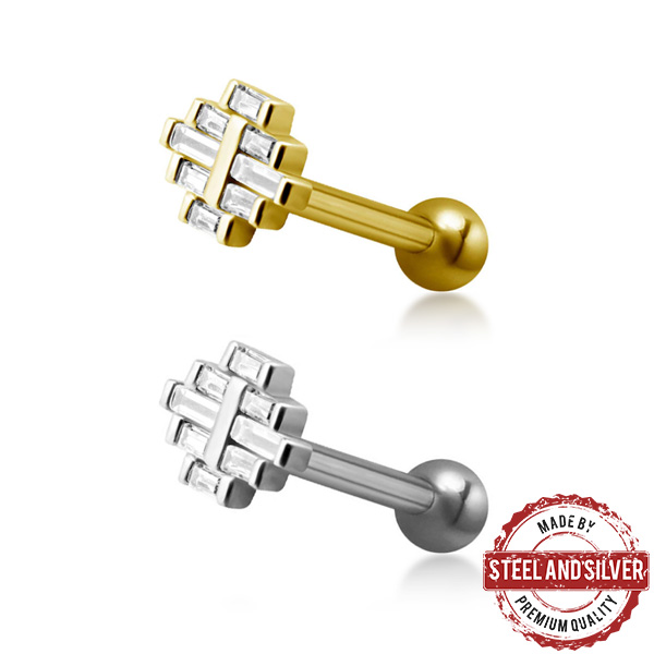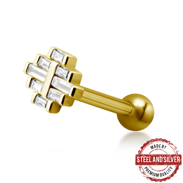 Микроштанга с внутренней резьбой из хирургической стали 316L. Представлена в двух вариациях: классическая стальная и с покрытием 24х каратного золота. Накрутка украшена прозрачными фианитами с огранкой "багет". Размер декоративной части: 6х8мм.