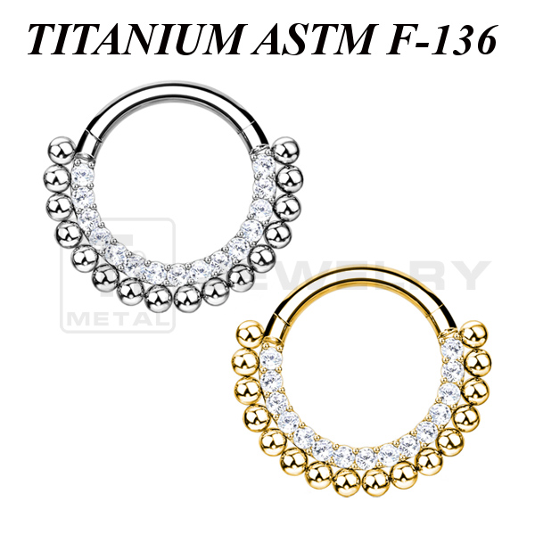 Кликер из имплантационного титана 6Al-4V-Eli ASTM: F-136 с рядом миниатюрных титановых шариков и сетом прозрачных фианитов. Представлен в двух вариантах: классический титановый и с золотым PVD покрытием.
