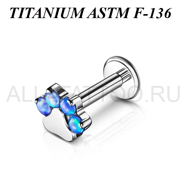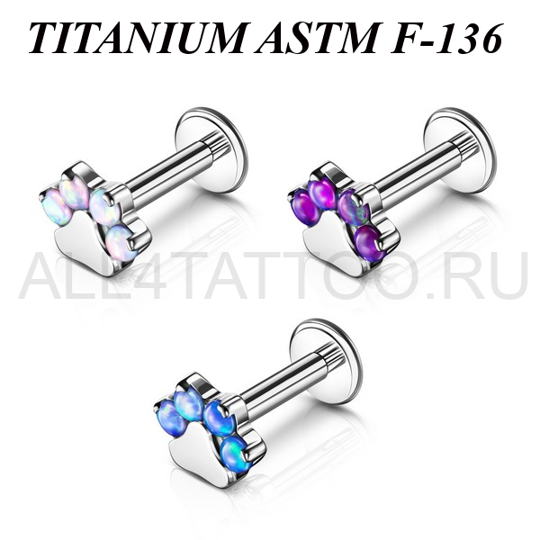 Лабрет с внутренней резьбой из имплантационного титана 6Al-4V-Eli ASTM: F-136  с накруткой в форме лапки, украшенной лабораторными опалами. Размер накрутки: 5,5х4,5мм.