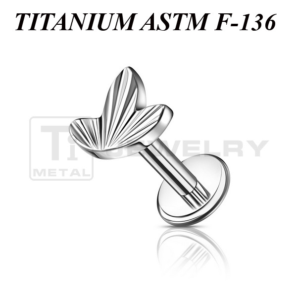 Лабрет из имплантационного титана 6Al-4V-Eli ASTM: F-136 с внутренней резьбой. Украшен накруткой в форме трёх лепестков. Размер накрутки: 6х5мм.