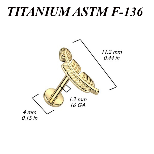 Лабрет из имплантационного титана 6Al-4V-Eli ASTM: F-136 с внутренней резьбой. Представлен в двух вариантах: классический титановый и с золотым PVD покрытием. Украшен накруткой в форме пера. Размер накрутки: 4,5х11мм.