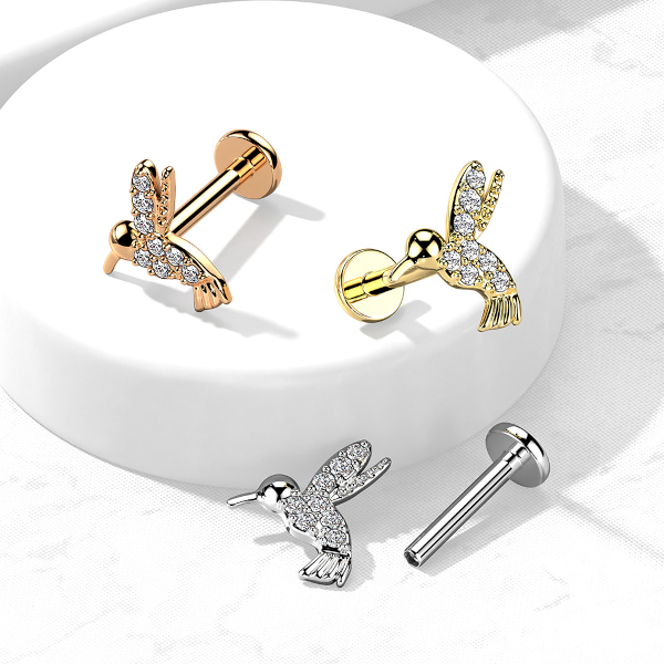 Лабрет из хирургической стали 316L с внутренней резьбой. Представлен в двух вариантах: классический стальной и с PVD покрытием жёлтого золота. Накрутка из родированной латуни, украшена фианитами. Размер накрутки: 9х8,5мм.