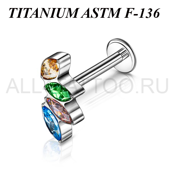 Лабрет с внутренней резьбой из имплантационного титана 6Al-4V-Eli ASTM: F-136. Украшен кластером с цветными кристаллами огранки "маркиз". Размер кластера: 11х5мм.