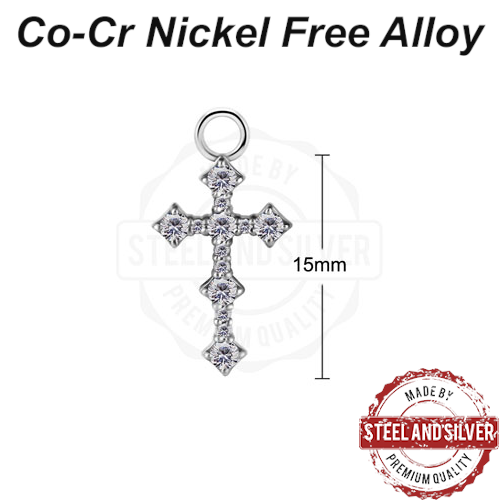 Подвеска из сплава кобальт-хрома, без содержания никеля размером 10х15мм. Украшена сетом кристаллов 1-2мм Premium Zirconia. Подходит для колец толщиной не более 1,6мм. Представлены в двух вариантах: классического стального цвета и с 18-ти каратным золотым PVD покрытием.