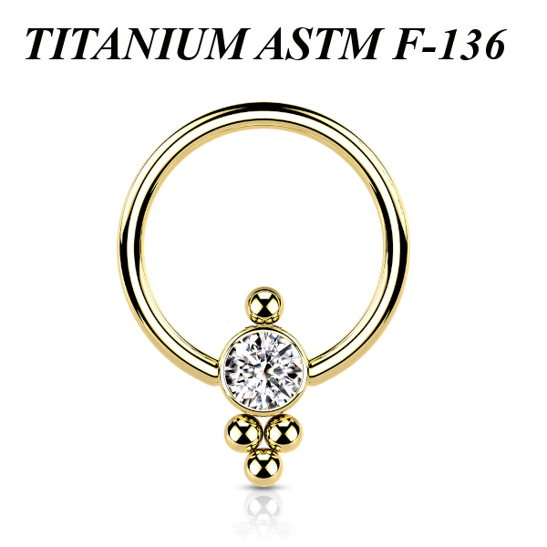 Кольцо из имплантационного титана 6Al-4V-Eli ASTM: F-136 с золотым PVD покрытием. Украшено кластером с фианитом.