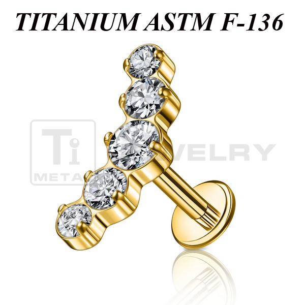 Лабрет с внутренней резьбой из имплантационного титана 6Al-4V-Eli ASTM: F-136. Представлен в двух вариантах: классический титановый и с золотым PVD покрытием. Украшен кластером с прозрачными фианитами. Размер кластера: 12х5мм.