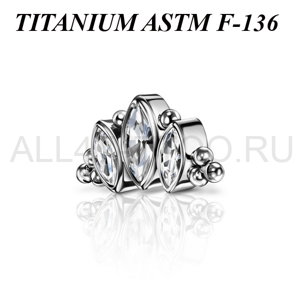 Кластер из имплантационного титана 6Al-4V-Eli ASTM: F-136. Украшен прозрачными фианитами огранки "маркиз". Размер декоративной части 5х9,5мм. Подходит для украшений с внутренней резьбой толщиной 1 и 1,2 мм.