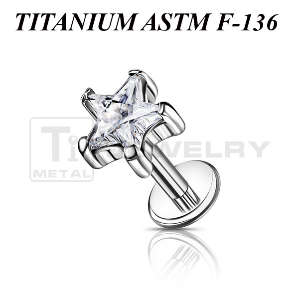 Лабрет с внутренней резьбой из имплантационного титана 6Al-4V-Eli ASTM: F-136 с фианитом в форме звёздочки, закреплённом в лапках.