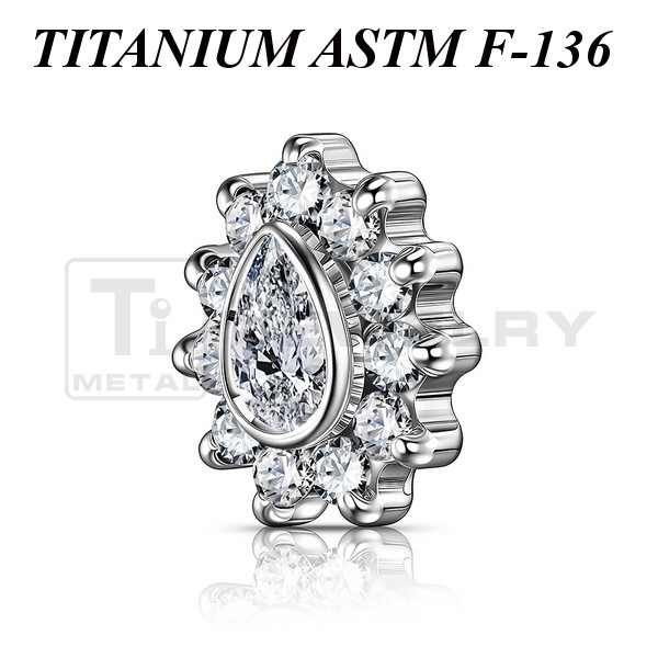 Кластер из имплантационного титана 6Al-4V-Eli ASTM: F-136 с прозрачными фианитами. Размер: 5,6х6,3мм. Подходит для украшений с внутренней резьбой толщиной 1 и 1,2 мм.