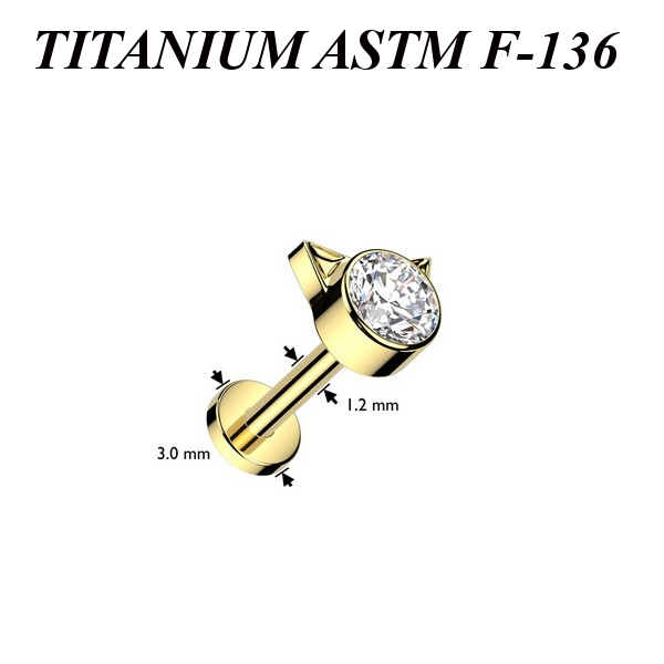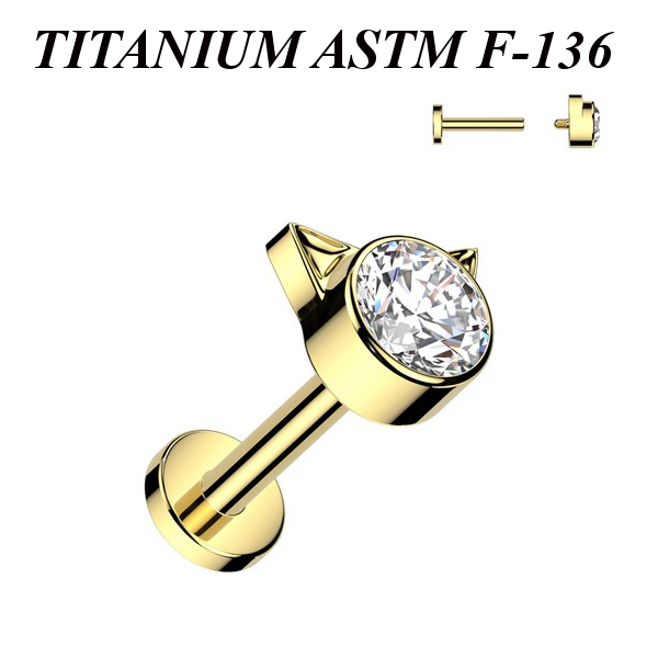 Лабрет с внутренней резьбой из имплантационного титана 6Al-4V-Eli ASTM: F-136 с золотым PVD покрытием. Накрутка украшена прозрачным фианитом.