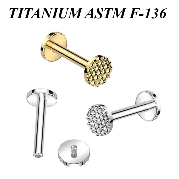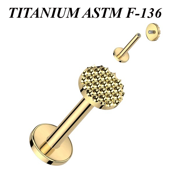 Лабрет с внутренней резьбой из имплантационного титана 6Al-4V-Eli ASTM: F-136. Представлен в двух вариантах: классический титановый и с золотым PVD покрытием.