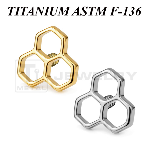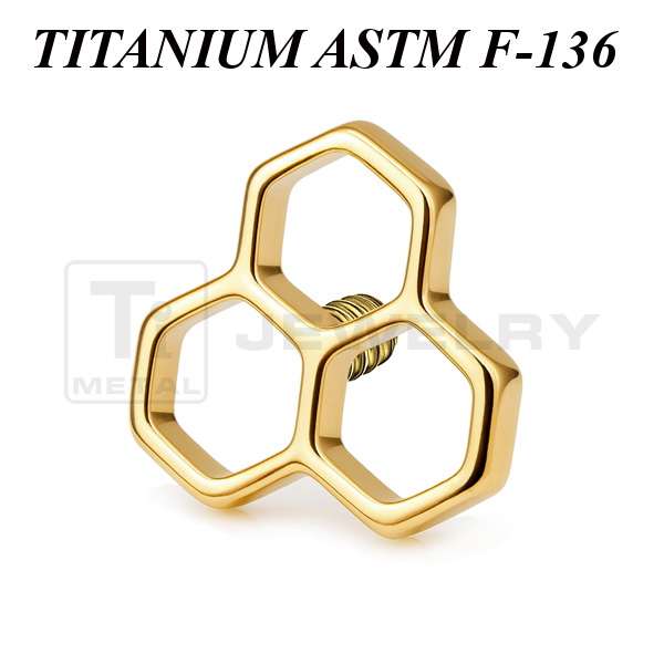 Накрутка из имплантационного титана 6Al-4V-Eli ASTM: F-136 в форме пчелиных сот диаметром 5мм. Представлена в двух вариантах: классическая титановая и с золотым PVD покрытием Подходит для украшений с внутренней резьбой толщиной 1 и 1,2 мм.