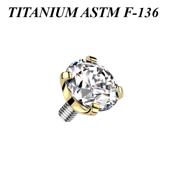 Накрутка из имплантационного титана 6Al-4V-Eli ASTM: F-136 с золотым PVD покрытием. Украшена прозрачным фианитом. Подходит для украшений с внутренней резьбой толщиной 1 и 1,2 мм.