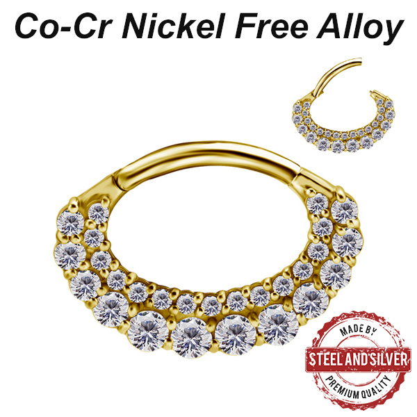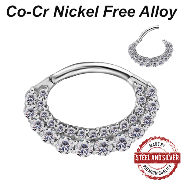 Овальный кликер из сплава кобальт-хрома, без содержания никеля. Украшен прозрачными кристаллами Premium Cubic Zirconia. Представлен так же вариант с 18-ти каратным PVD покрытием.